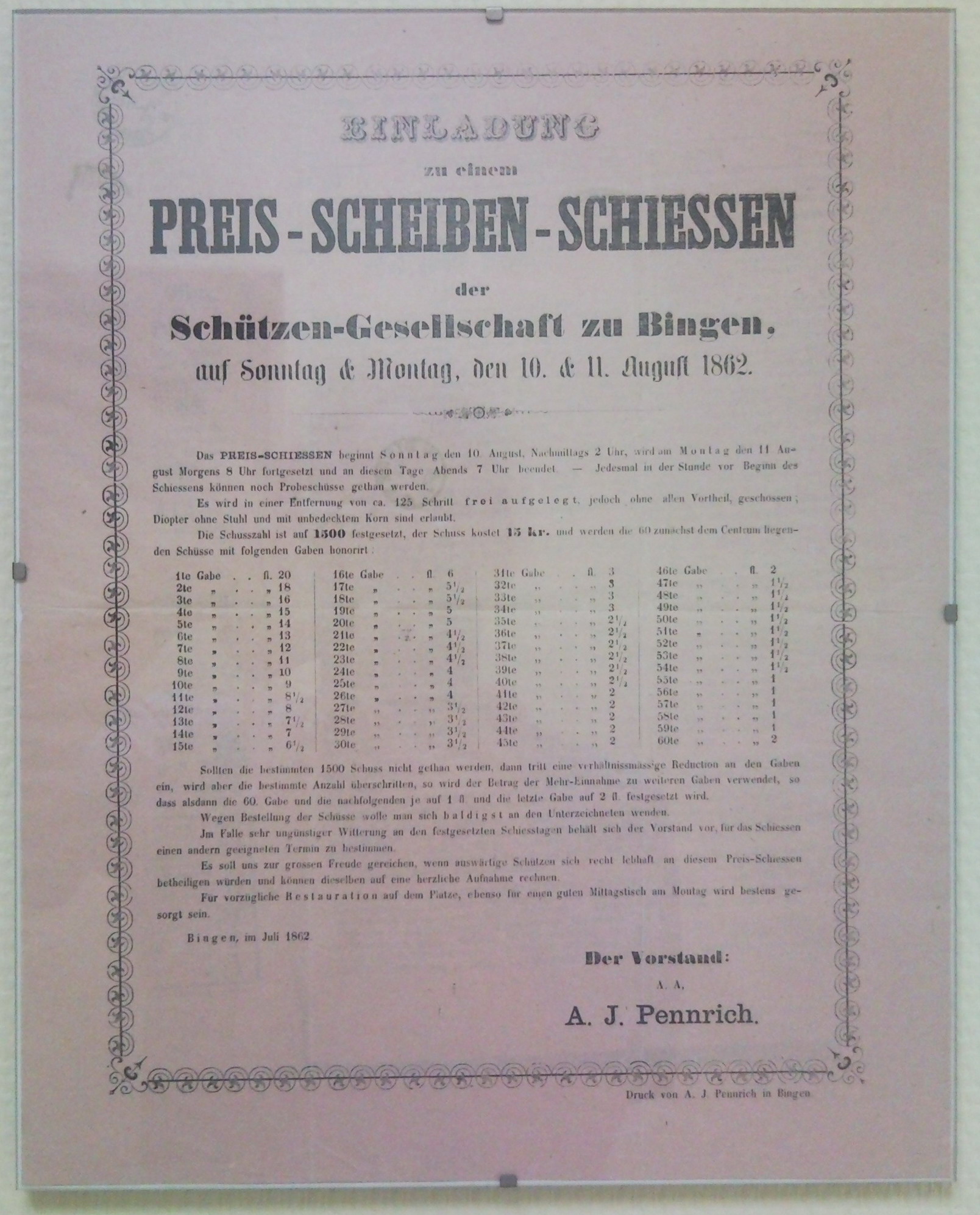 10.-11.08.1862 | Preis-Scheiben Schießen der Schützengesellschaft zu Bingen | |